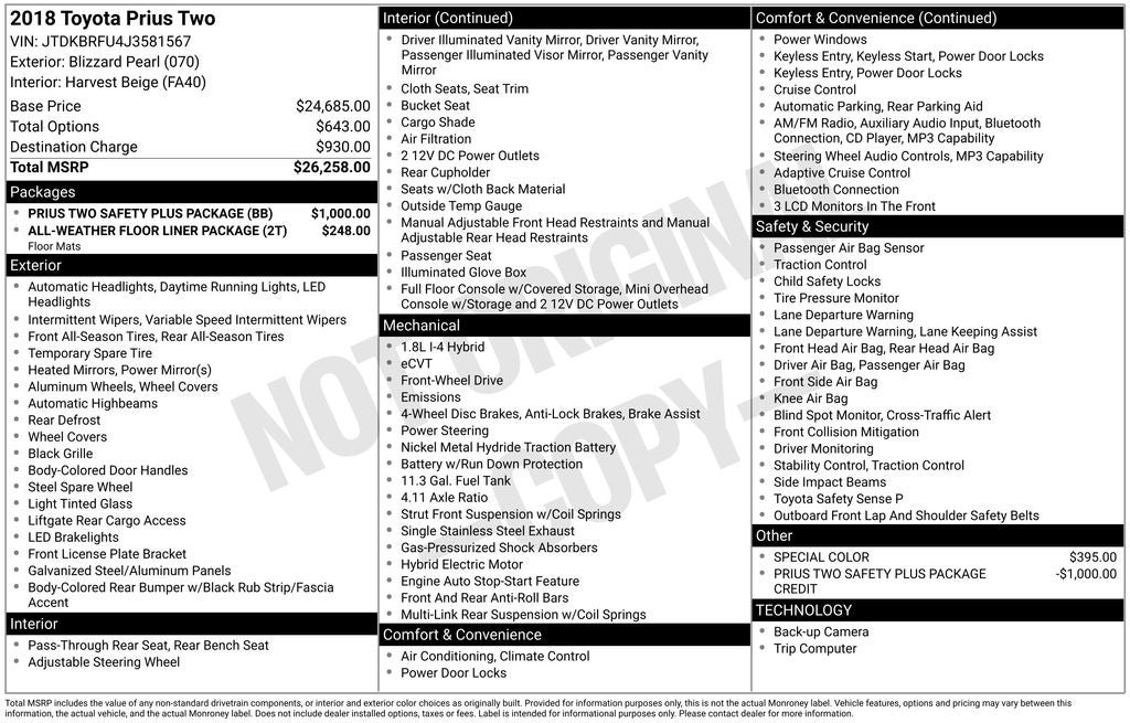 Blizzard Pearl Two FWD CVT 1.8L 4-Cylinder DOHC 16V VVT-i Back Up Camera, Bluetooth®, Alloy Wheels, Audio Controls on the Steering Wheel, Blind Zone Monitoring, CD Stereo with Auxiliary Input, Clean Cloth Interior, Cruise Control, Dual Climate Control, Proximity Keyless Entry, Rear Parking Sensors, Rear View Camera, Satellite Radio, Side Air Bags, 1.8L 4-Cylinder DOHC 16V VVT-i, 4-Wheel Disc Brakes, 6 Speakers, ABS brakes, Air Conditioning, Alloy wheels, Auto High-beam Headlights, Blind Spot Monitor (BSM), Brake assist, Bumpers: body-color, Delay-off headlights, Dual front impact airbags, Electronic Stability Control, Exterior Parking Camera Rear, Front Center Armrest, Heated door mirrors, Intelligent Clearance Sonar (ICS), Knee airbag, Occupant sensing airbag, Overhead airbag, Overhead console, Power windows, Prius Two Safety Plus Package, Rear window defroster, Split folding rear seat, Steering wheel mounted audio controls.
