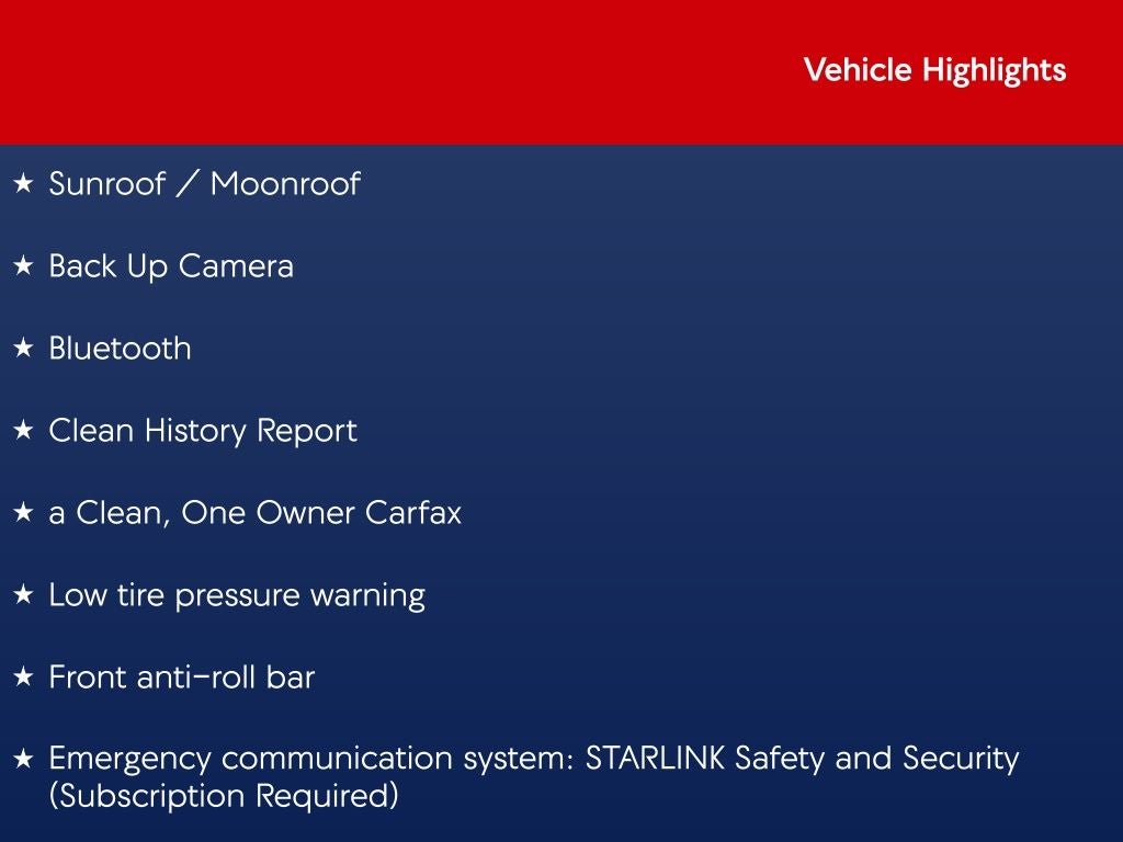- Emergency SOS Capable STARLINK Safety and Security (Subscription Required) vehicle integrated emergency SOS system