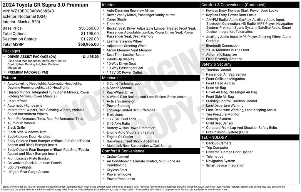 New Price! Nocturnal 2024 Toyota GR Supra 3.0 Premium RWD 6-Speed Manual 3.0L I6 DOHC 24V