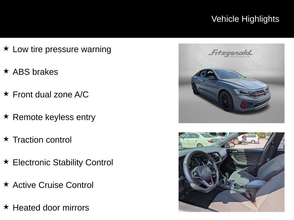 2024 Gray Volkswagen Jetta GLI 6-Speed Manual ABS brakes, Active Cruise Control, Alloy wheels, Electronic Stability Control, Front dual zone A/C, Heated door mirrors, Heated Front Seats, Heated front seats, Illuminated entry, Low tire pressure warning, Remote keyless entry, Traction control. 2.0L TSI DOHC 40TH ANNIVERSARY You will love our NO HAGGLE, NO HASSLE PRICING here at Fitzgerald Auto Mall. Ask us about our BUYER PROTECTION PLAN, LOANER CAR PROGRAMS, AND FREE Vehicle History Report. Can not find what you want?? NO PROBLEM! We have over 1,000 Pre-Owned vehicles available at WWW.FITZMALL.COM. You can also visit us in person at 114 Baughmans Lane Frederick MD, 21702 or Call Us @240-629-7301.