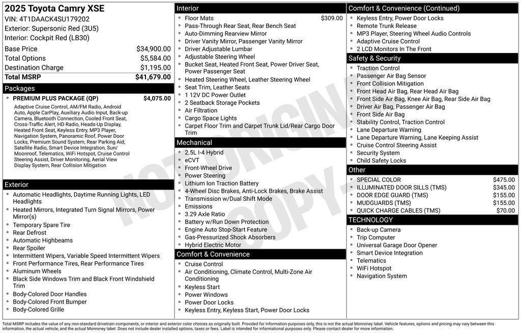 Certified. Supersonic Red XSE FWD eCVT 2.5L 4-Cylinder 16V DOHC Sunroof / Moonroof, Back Up Camera, Bluetooth®, Clean History Report, a Clean Carfax, 2.5L 4-Cylinder 16V DOHC, Cockpit Red w/Leather Seat Trim, 10 Color Head-Up Display, 4-Wheel Disc Brakes, 6 Speakers, ABS brakes, AM/FM radio: SiriusXM, Apple CarPlay/Android Auto, Auto High-beam Headlights, Automatic temperature control, Brake assist, Digital Key Compatibility, Driver Attention Monitor, Dual front impact airbags, Dual front side impact airbags, Electronic Stability Control, Emergency communication system: Safety Connect (up to 10-year trial subscription), Exterior Parking Camera Rear, Four wheel independent suspension, Front & Rear Parking Assist w/Automatic Braking, Front anti-roll bar, Front Cross-Traffic Alert, Front dual zone A/C, Fully automatic headlights, Heated door mirrors, Heated Front Bucket Seats, Heated steering wheel, Knee airbag, Lane Change Assist, Low tire pressure warning, Occupant sensing airbag, Overhead airbag, Panoramic Glass Roof, Panoramic View Monitor, Passenger door bin, Power door mirrors, Power driver seat, Power passenger seat, Power windows, Premium Plus Package, Radio: Toyota Audio Multimedia w/12.3 Touchscreen, Radio: Toyota Audio Multimedia w/JBL, Rear anti-roll bar, Rear Cross-Traffic Braking, Rear side impact airbag, Rear window defroster, Remote keyless entry, Security system, Speed-sensing steering, Split folding rear seat, Steering wheel mounted audio controls, Telescoping steering wheel, Tilt steering wheel, Traction control, Traffic Jam Assist, Variably intermittent wipers, Ventilated Front Seats, Wheels: 19 Smoke Gray & Black-Finished Alloy.
