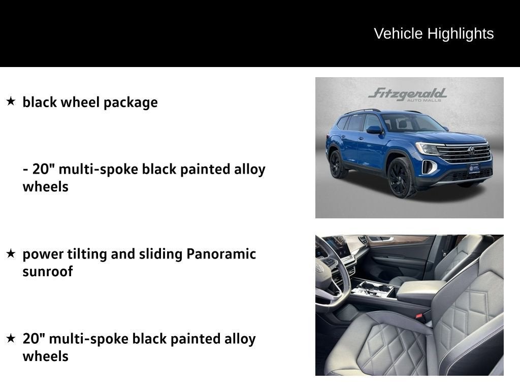 2025 Mountain Lake Blue Metallic Volkswagen Atlas 8-Speed Automatic 20 multi-spoke black painted alloy wheels, black wheel package, power tilting and sliding Panoramic sunroof. 2.0L TSI 2.0T SE w/Technology Volkswagen Certified Pre-Owned Details: